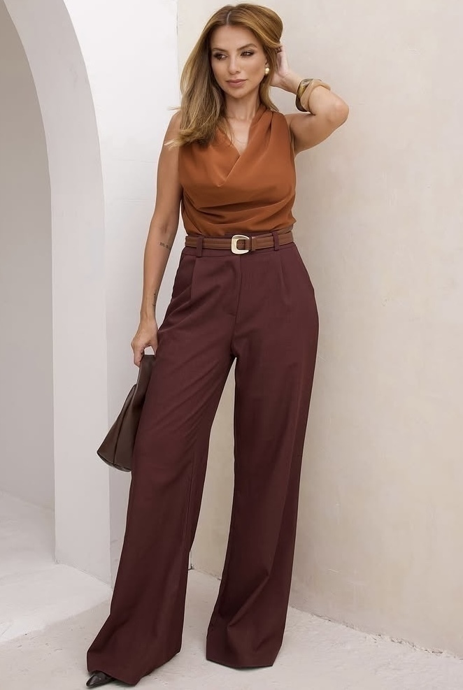 A Calça Alfaiataria Marrom no modelo wilde leg é a escolha ideal para quem busca unir elegância e praticidade no dia a dia. Com corte amplo e fluido, ela valoriza a silhueta enquanto proporciona liberdade de movimento.